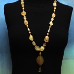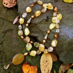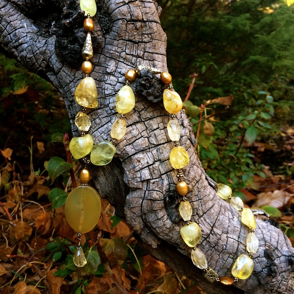 36″ hand-cut and tumbled yellow ice-flake quartz and citrine gemstones, fresh water pearls and antiqued 24K gold vermeil